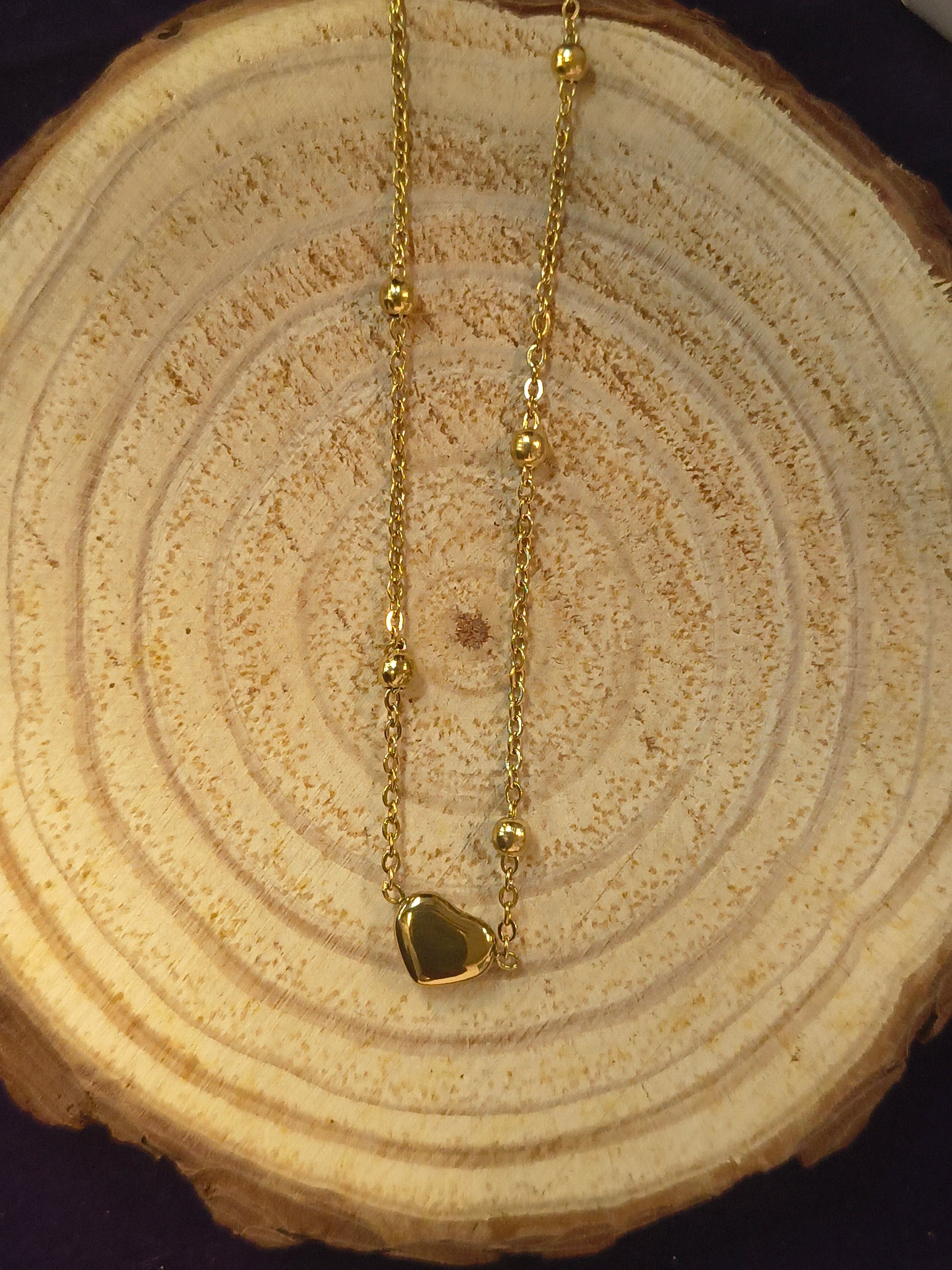 Stand out with this anklet featuring bold gold balls and a prominent heart charm. Perfect for making a stylish statement and enhancing your ankle accessory collection.