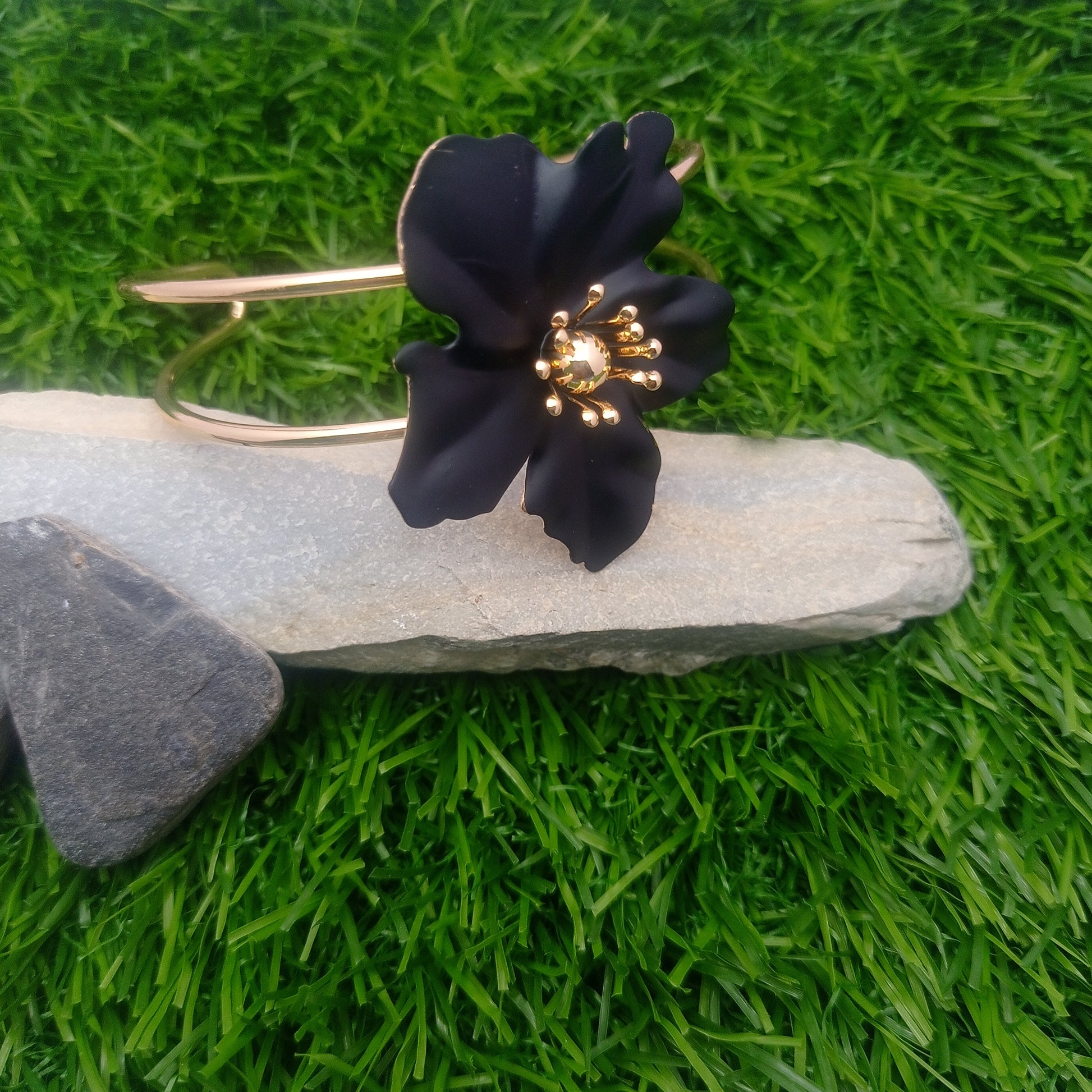 A chic cuff bangle featuring a black daisy charm, adding bold floral elegance to your everyday outfits.