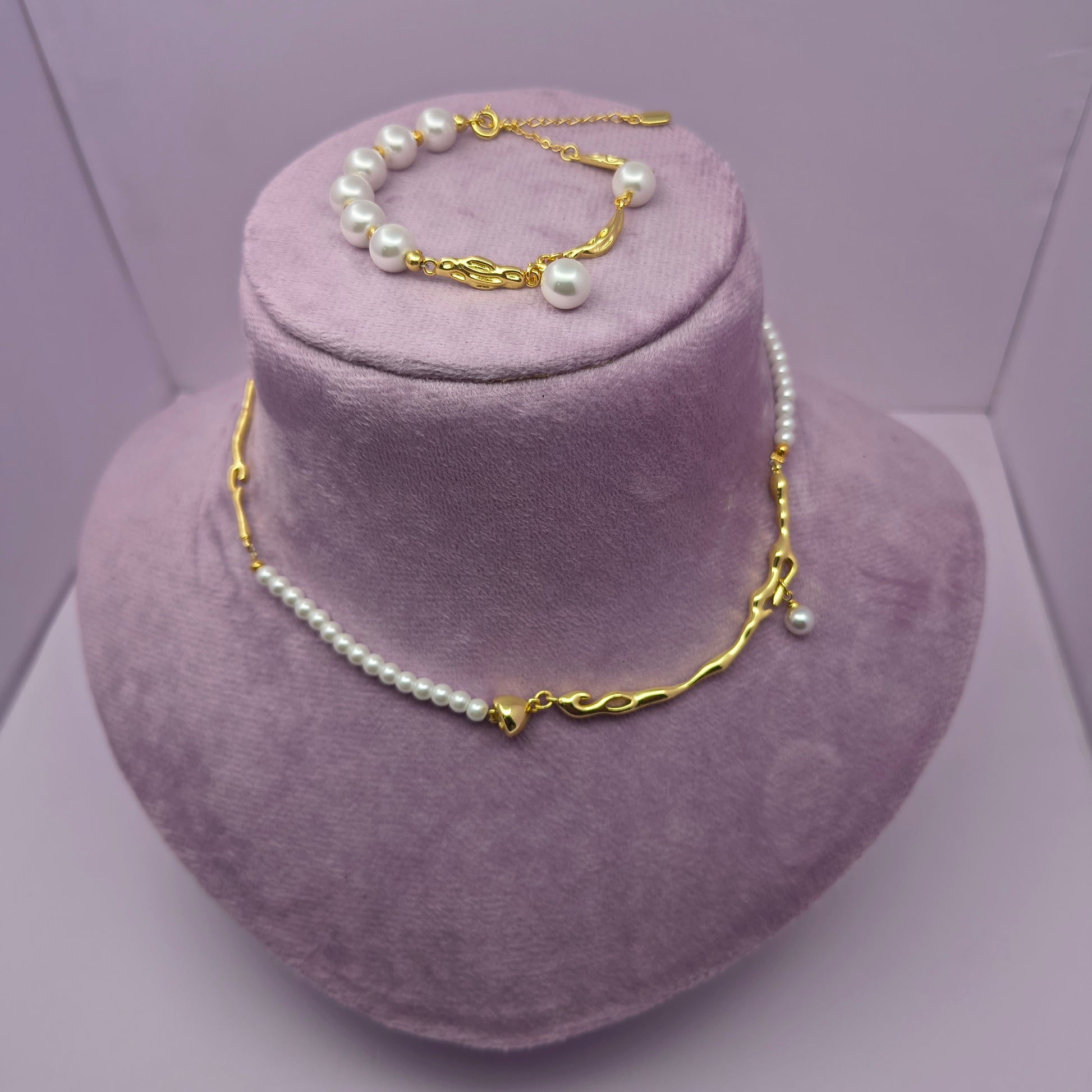 A polished jewelry set featuring luminous pearls set against a radiant gold finish.
