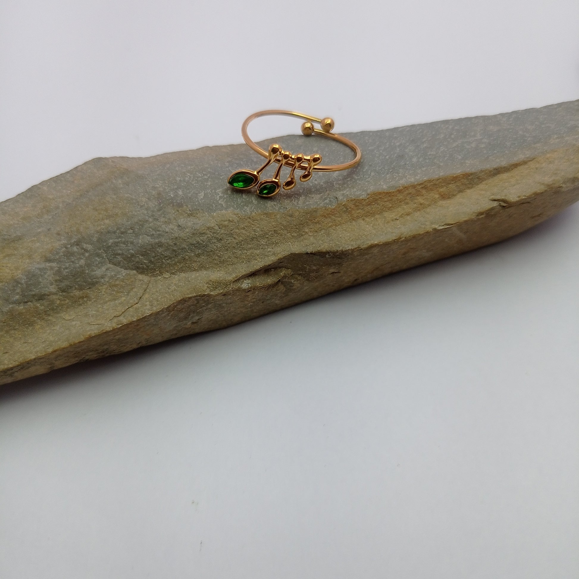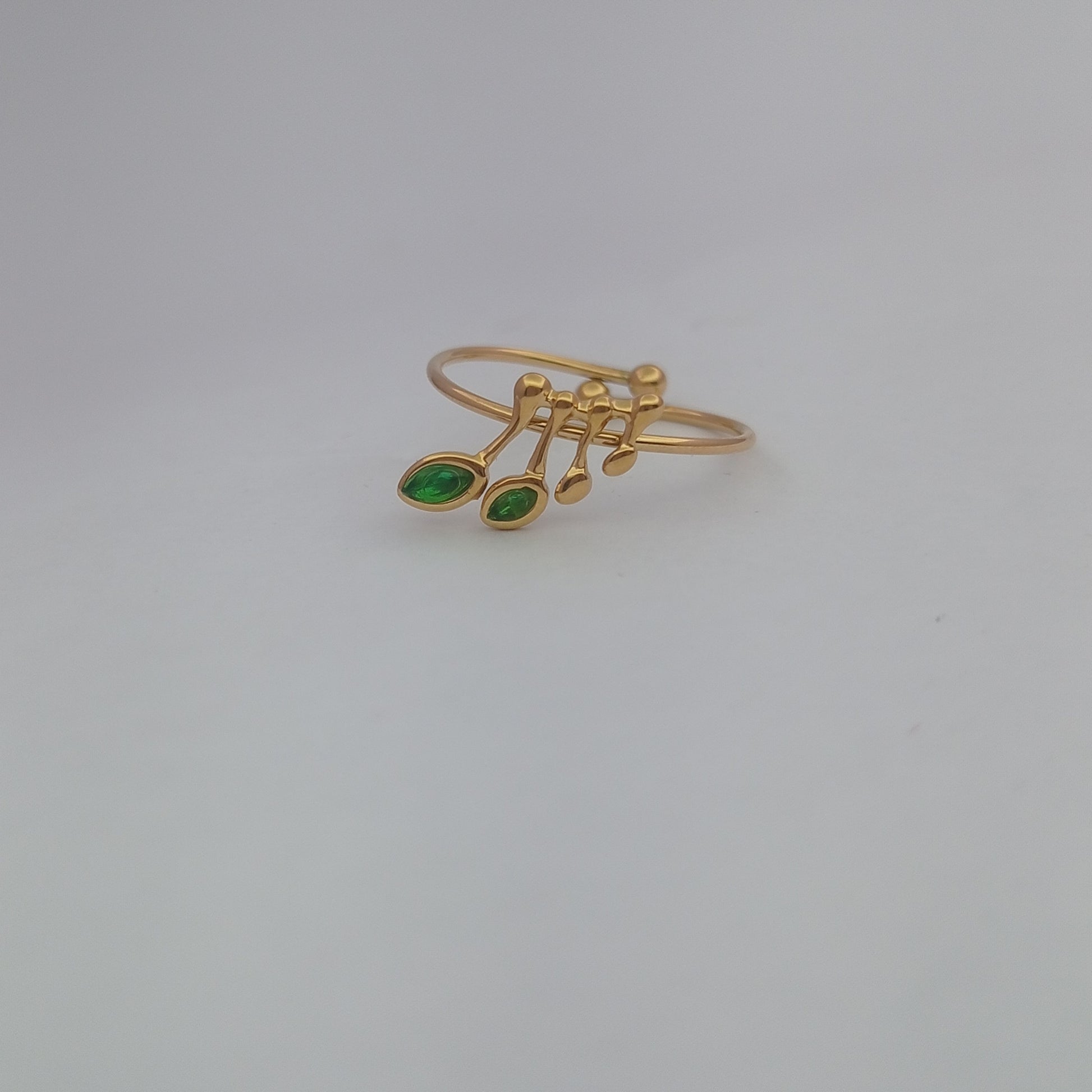 An elegant adjustable ring featuring a green stone set in a musical note design. Perfect for music lovers who enjoy minimal stylish accessories.