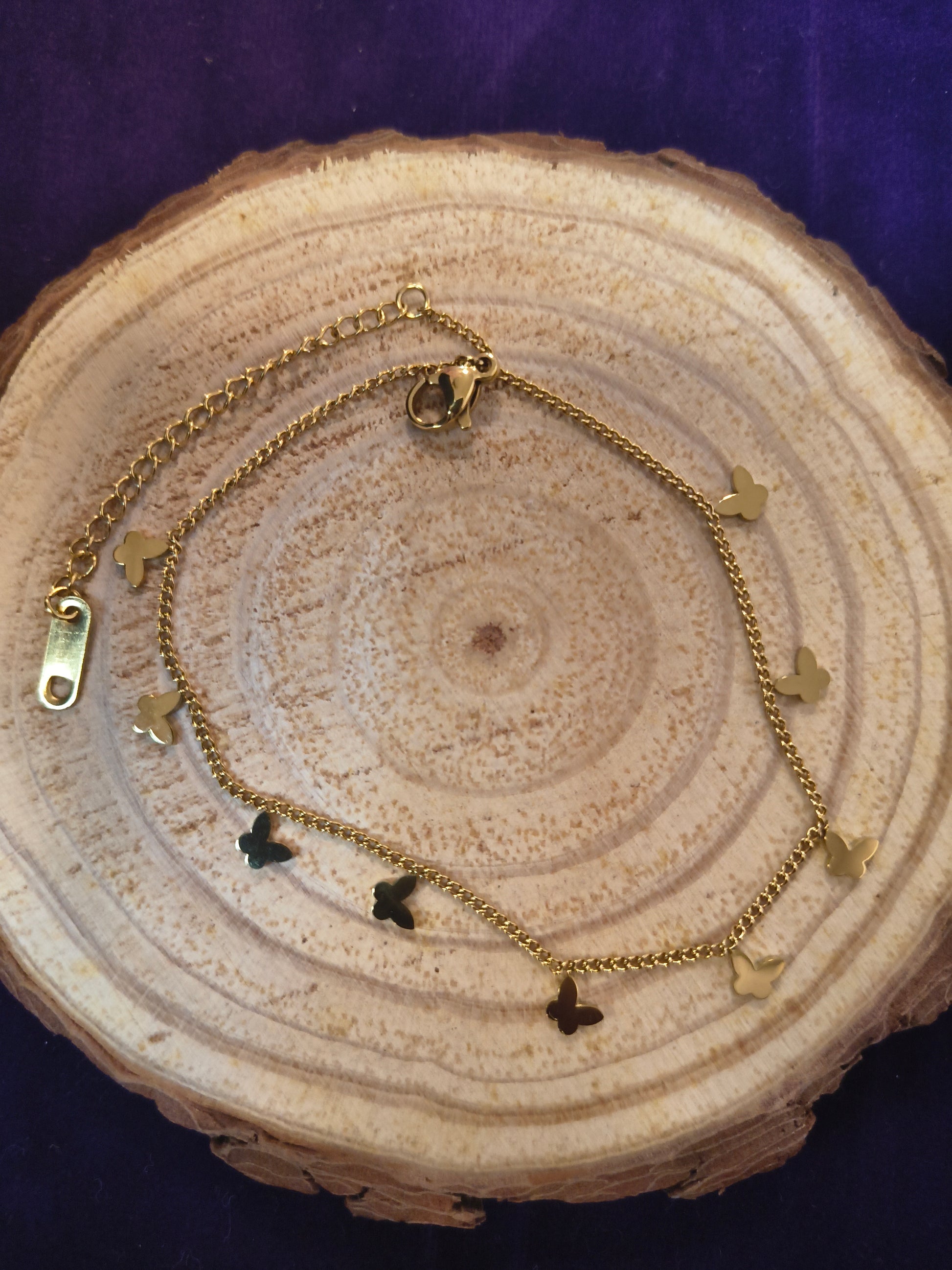Small and delicate butterfly charms adorn this dainty gold-plated anklet. Perfect for a subtle, charming accessory that enhances any outfit effortlessly.